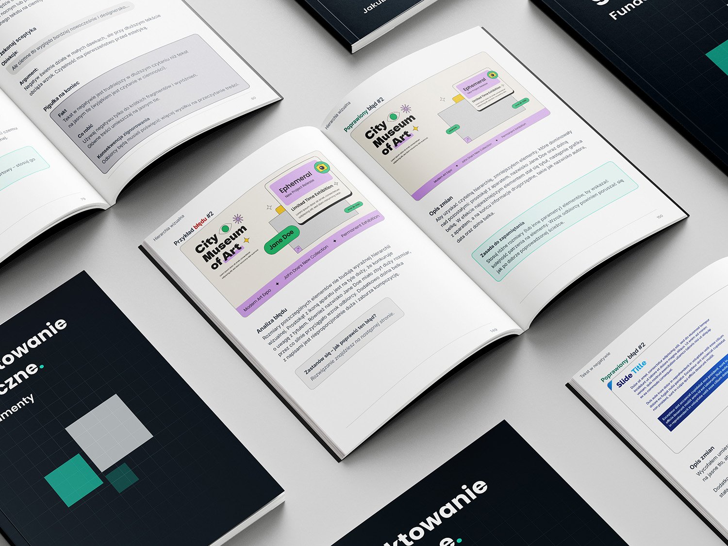 Zobaczysz 82 konkretne przykłady błędów wraz z gotowymi rozwiązaniami. Widzisz błąd → rozumiesz, dlaczego to błąd → dostajesz poprawioną wersję. Część przykładów to uproszczone plansze, które błyskawicznie wyjaśniają najważniejsze zasady, a część – realne slajdy.Bonus: graficzne podsumowanie wszystkich zasad